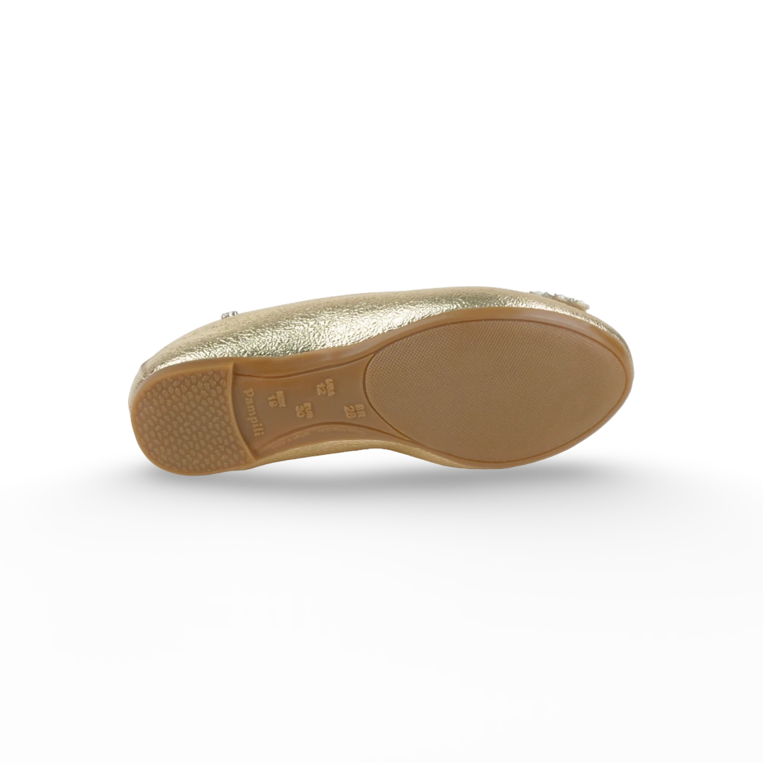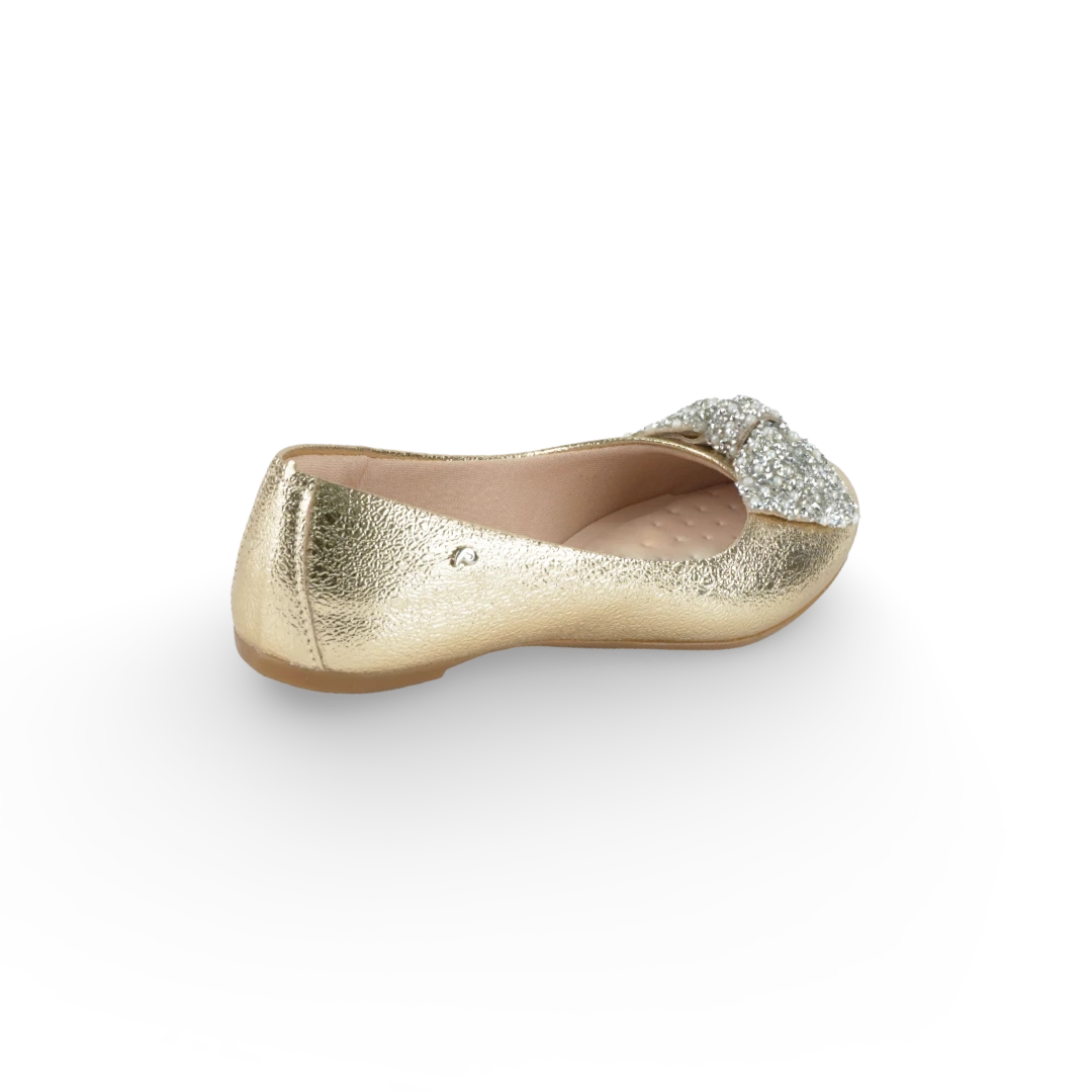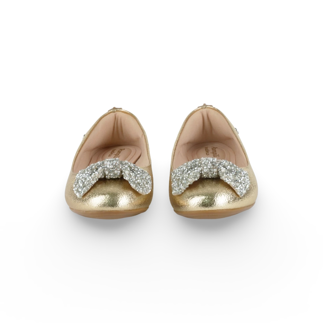 Bailarina dorada con moño brillante. Su moño dorado y acabado metalizado reflejan la alegría y estilo de las pequeñas.