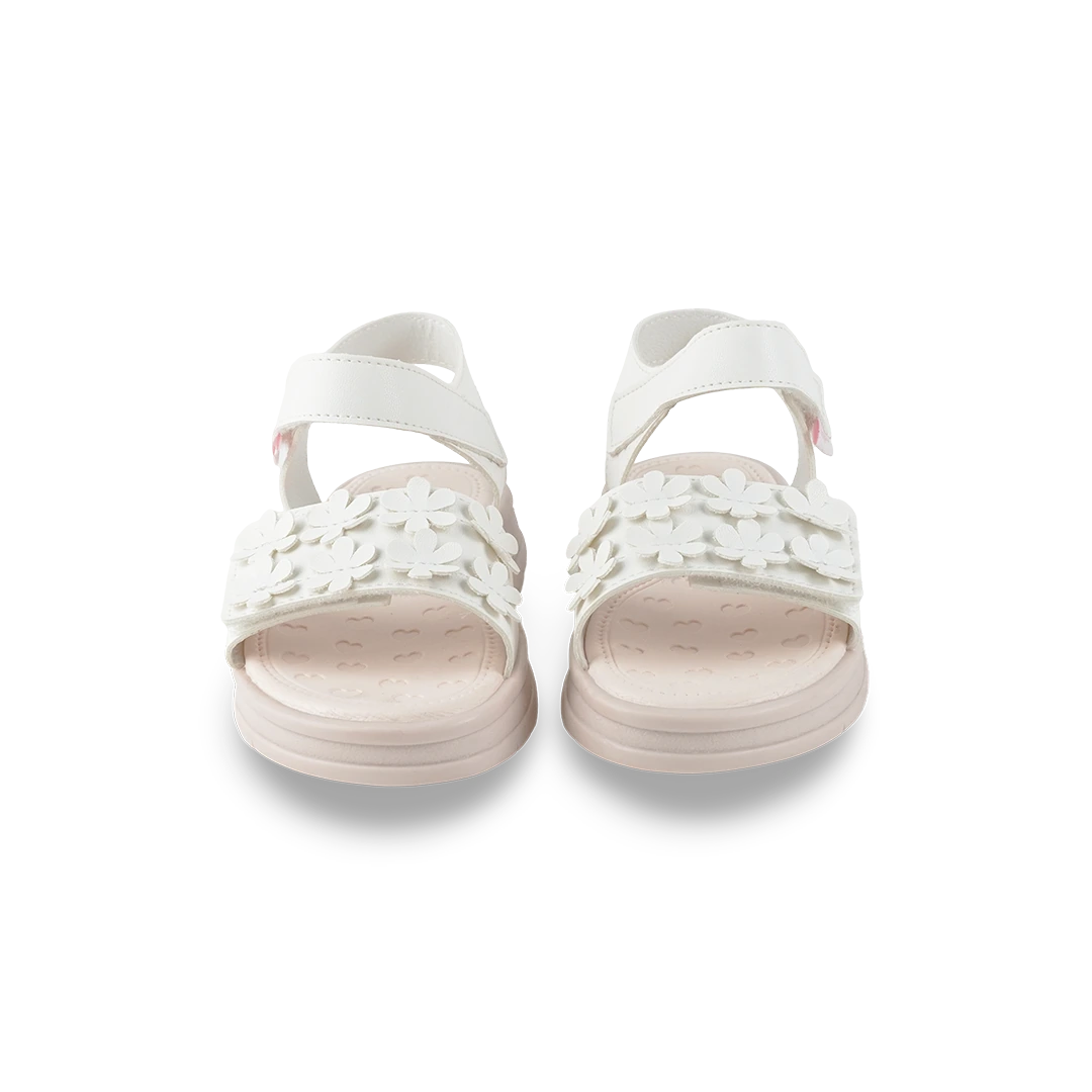 Sandalia para niñas en material plateado, con mini flores 3D en la parte superior que aportan un toque de ternura y hacen que el look de las más pequeñas sea aún más divertido.